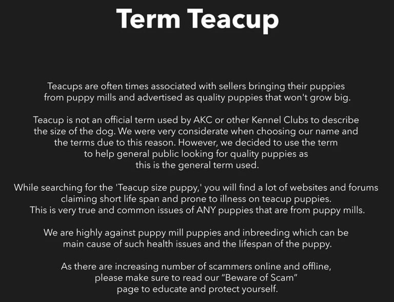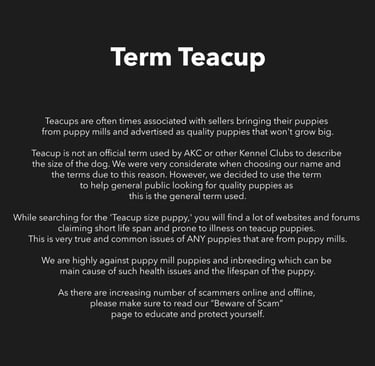 We're specializing in Teacup & Micro size Puppies focusing on unique types and color, facial features and great proportions. Our puppies are the exquisite rare types everyone wants, but can't easily find. When it comes to these precious babies, we do not focus on numbers, but quality, beauty and love. We breed because we have a lot of love to give to these precious babies, because we have a passion for perfection, because we want to give you a chance to bring home a tiny bundle of beautiful love and because we are just addicted to hearing: